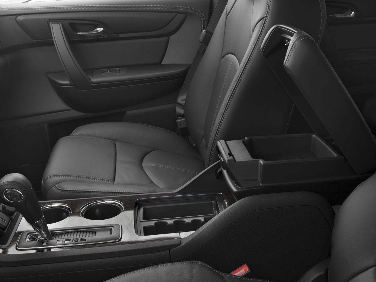 - Console, front center with 2 cup holders, covered storage bin and sliding armrest with storage